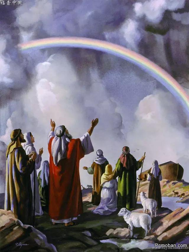 下面我们就看第九章,上帝再次赐福挪亚和他的儿子。其他的人类都灭绝了,只剩下这一家,应该说这是人类的一个新的开始,挪亚就成为新的人类始祖,取代了亚当古时候的地位。所以上帝对亚当的祝福是要他生养众多,遍满全地,那么对挪亚和他的儿子们也是这样说,“你们要生养众多,遍满了地。”创9:1 我们需要注意到这样一个问题,上帝和他们立约了,这个约里面有一个记号,我们翻到创世记9:9-17 “我与你们和你们的后裔立约,并与你们这里的一切活物,就是飞鸟、牲畜、走兽,凡从方舟里出来的活物立约。我与你们立约,凡有血肉的,不再被洪水灭绝,也不再有洪水毁坏地了。”上帝说:“我与你们并你们这里的各样活物所立的永约是有记号的。我把虹放在云彩中,这就可作我与地立约的记号了。我使云彩盖地的时候,必有虹现在云彩中,我便记念我与你们和各样有血肉的活物所立的约,水就再不泛滥毁坏一切有血肉的物了。虹必现在云彩中,我看见,就要记念我与地上各样有血肉的活物所立的永约。”上帝对挪亚说:“这就是我与地上一切有血肉之物立约的记号了。”
