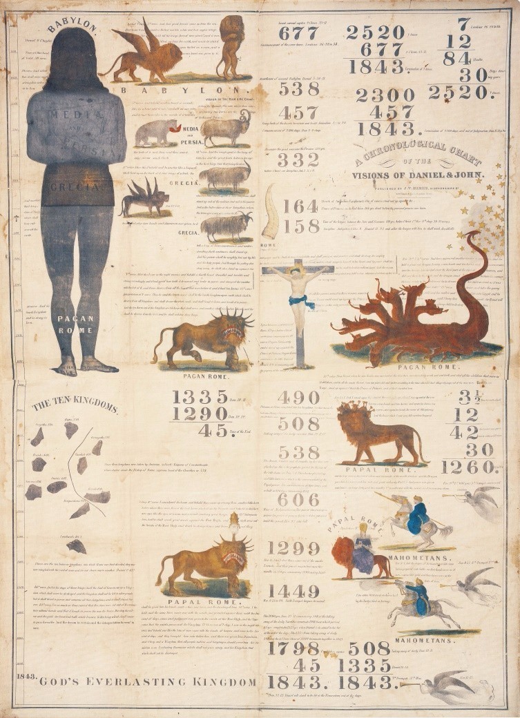 但是这个表上的其他数字是没有错误的,比如说右下角的508年+1335年=1843年,同样是1843,但这里没有错误,因为但以理书预言说:“等到一千三百三十五日的,那人便为有福”(但12:12)。按照这个预言,1843年就是迎候的时间,等到这一天的人“便为有福”。复临运动先驱们等到了最后,预备好了迎见主,所以是有福的。后来怀爱伦写过一些文章,说在1843年已经应验1335日的预言,不用再到别处去找1335日的应验了。