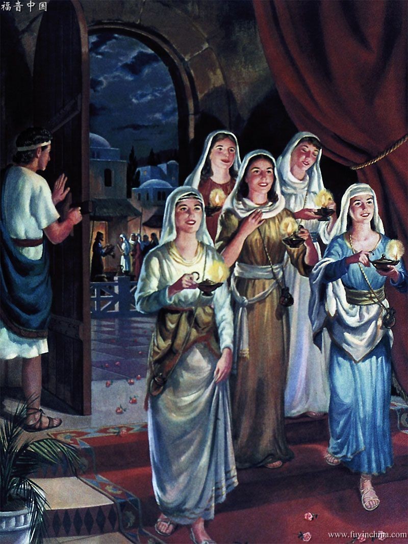 这更进一步的应验了婚筵的比喻,这个比喻在马太福音25章:“那时,天国好比十个童女拿着灯出去迎接新郎。其中有五个是愚拙的,五个是聪明的”(太25:1-2)。前两节是最重要的,告诉我们这个比喻是讲什么的,很多人误解为耶稣在讲婚宴,而没看到重点:天国。天国才是这个故事的主题。我们清楚这里是讲天国的比喻,才好理解比喻的内容。在这十个童女的中间,有五是愚拙的,五个是聪明的。愚拙的她们都拿着灯,却不预备油;聪明的带着灯,也预备了油。这时“新郎迟延的时候,她们都打盹了,睡着了。”出现了“新郎”这比喻就好理解了,“新郎”是耶稣,那这些等候迎接耶稣的童女就是复临信徒了。 fuyin.com