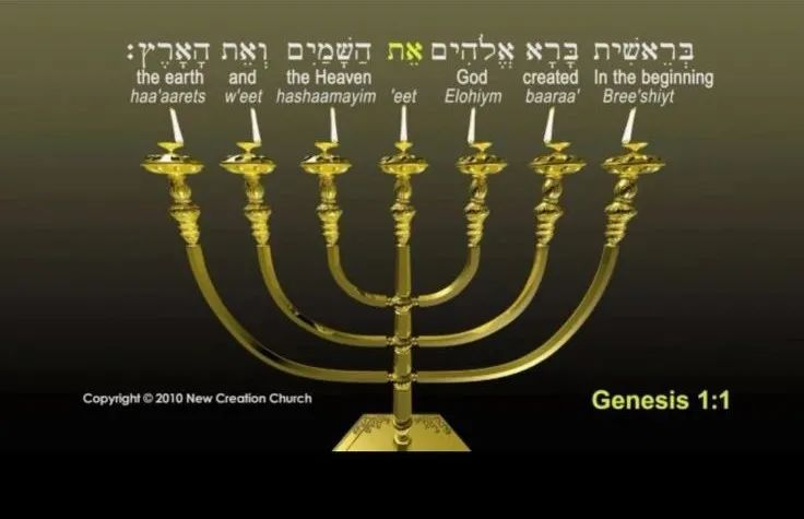 再在第一句话里,第四个单词就是ֵֵאת. 这个词中文圣书没有翻译,英文圣书也没有翻译。约翰说“太初有道”的时候,“道”在哪里呢?就是这个字。有人把它译成了“道”。ִאת(道)旁边的第三个字,就是上帝(ֱאלִֹהים,Elohim),是和上帝摆在一起的,“道”是与上帝同在的。在《创世记》第一句话中,也有这样的表现。