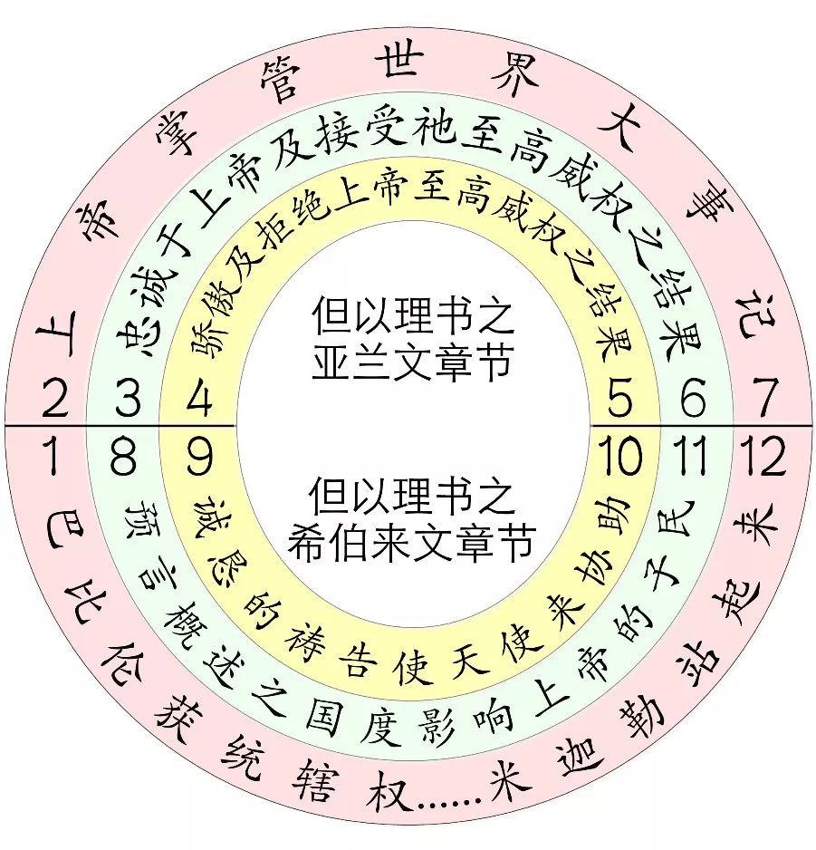 但以理的文采非常好,他写这本书的时候,采用的是一种环环相扣的结构:第一章对应第二章;第三章对应第八章;第四章对应第九章;第五章对应第十章;第六章对应第十一章;第七章对应第十二章,每一章都有相对应的内容。从上图看来,他把世界要发生的事件,在文笔结构上进行了一个很有趣的展示,亚兰文的章节和希伯来文的章节是分开处理的。我们从文学角度上来看,能看到它的主调。但事实上从更多的情况来看,相比较一下,这卷书和《创世记》是有些联系的。