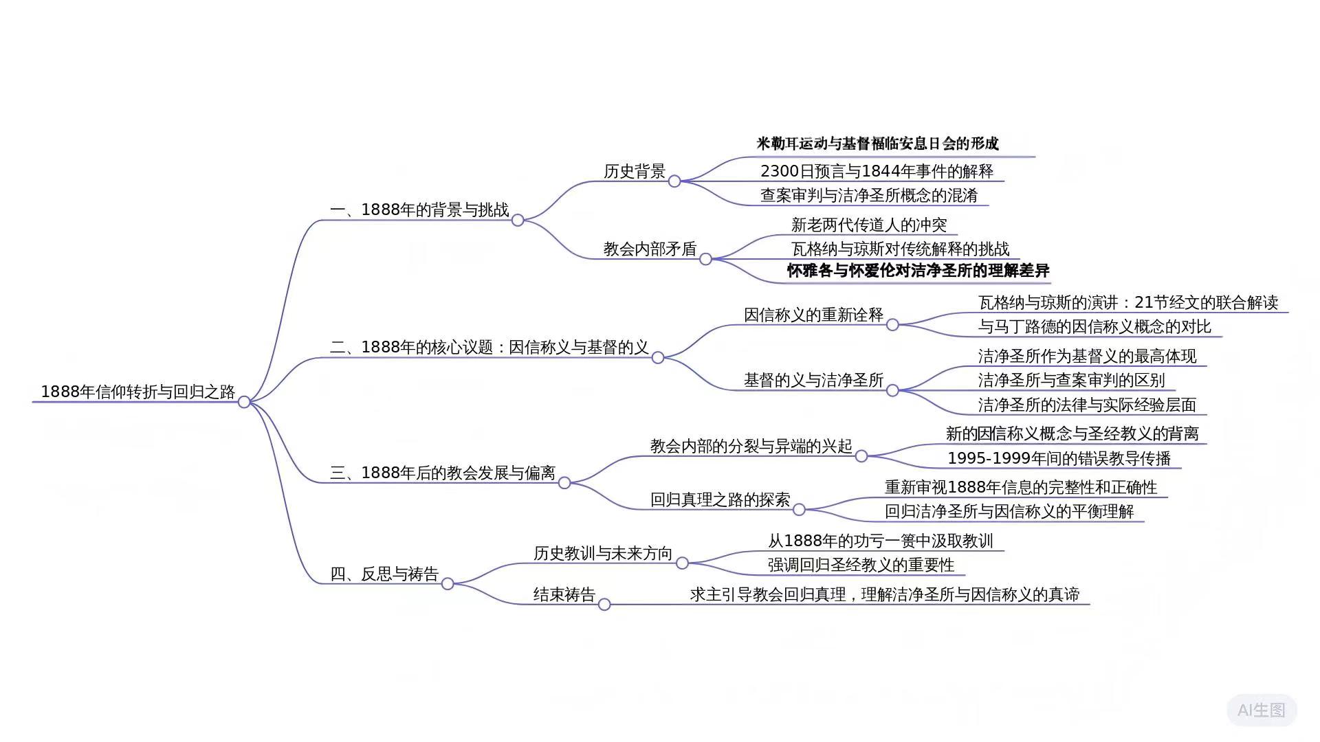 当然今天还有人给他翻案,翻案是另外一回事。有怀师母写的很多《证言》放在那个地方,我想我们没有必要为他跟“预言之灵” 写的东西对着来,认为还会有人比圣灵的启示对这个事件看的更透,那他们最终的结局又会是什么?这不是我们今天讨论的事情,我们所看到的就是这样一个倾向。1888成为一个新的转折点,我们出现了两套语言。这个时候旧的圣所的语言还在,但是宗教改革的这一整套对‘因信称义’ 的语言就逐步的进入教会,而且将在1919年成为新的主体的语言。那1901~1919年期间又发生了怎样的变化?让我们再一次绕了一个弯路,我们下次再说。 copyright fuyinchina