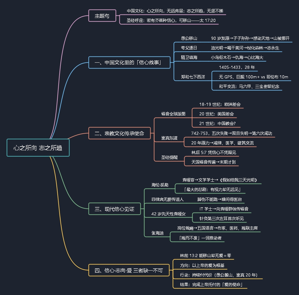 我们再说最后的一段经文,林前13:2。保罗说,我若有先知讲道之能,也明白各样的奥秘,各样的知识,而且有全备的信,叫我能够移山,却没有爱,我就算不得什么。我们有心之所向,我们有志之所趋,我们还需要有爱之所存。因为没有爱你所有的方向,你所有的行动,都可能得不到上帝的祝福。我们在教会里对上帝的爱、基督徒的爱、父母的爱、人间的爱,已经讲了很多。我在这儿就不进一步发挥了。我们的爱是符合上帝诫命这样规范的爱,才能蒙上帝的祝福,但是我们今天的分享,心之所存—— 我们的信心,我们的行动;志之所趋—— 建立在上帝爱的根基上。也愿我们今天的分享激发我们的信心,推动我们的行动,让我们去完成上帝交给我们的爱的使命。