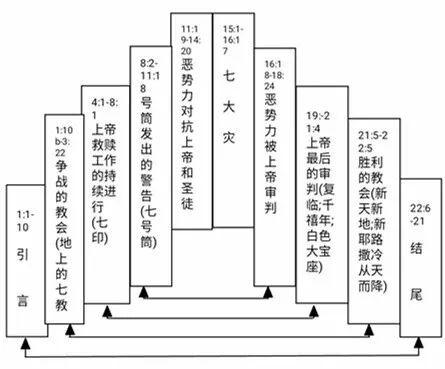 这些交叉对应的板块,它的分析对于我们了解《启示录》,无疑都有积极的帮助。但它们也都有一些缺陷,不是那么确切。在每一个对应的板块中,总是有一些差强人意勉强的部分。虽然学者们在分析这种交叉对应时得出的结论,其实也没有一致的答案,但却说明一个问题,就是我们的确可以从《启示录》找到这种经文的彼此对应关系。