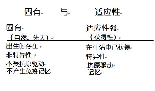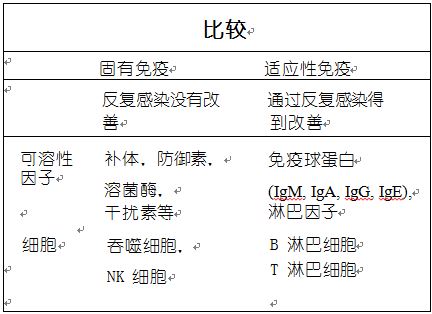 表 4 再次比较了固有免疫和获得性免疫。在表中,您会看到“反复感染没有改善或改善”的表述。您能找到另一种表达此引用的方法吗如果说“记忆”与“没有记忆”,那是绝对正确的。换句话说,固有免疫没有记忆, 而获得性免疫有记忆。