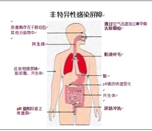 请看一下图 1,其中列出了各种因素,例如眼泪和其他分泌物中的溶菌酶,共性(居住在我们体内的友好微生物),粘液,纤毛等。这些因素是否属于天然免疫或适应性免疫?答案是:当然,它们是“原驻民免疫豁免”的一部分。请注意“非特异”一词,这是天然免疫的特征。在离开本主题之前,请允许我再强调一次:我只想提醒您,有益细菌(图中的共生体)是我们防御机制的一部分。当有人感染病毒时,绝不应该使用抗菌素。我们杀死有益细菌时,会杀死我们看不见的忠诚战士。