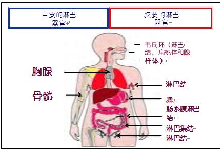 图 2 显示了两种类型的淋巴器官。主要的淋巴器官是指淋巴细胞发育的地方。次要淋巴器官是淋巴细胞的活动场所。两个主要的淋巴器官是胸腺和骨髓。胸腺产生T淋巴细胞,而骨髓是B 淋巴细胞的衍生地。次要淋巴器官包括各种淋巴结和脾脏。