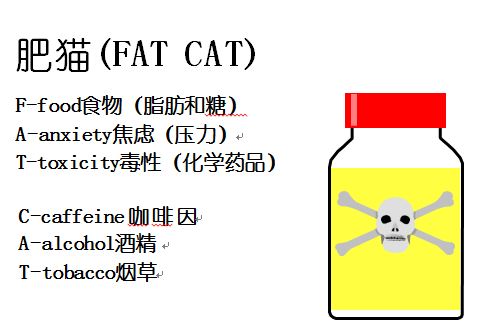 制糖的丰富食物),焦虑(压力)和毒性(化学物质)。“猫”